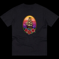 This staple tee wears like a lived-in favorite. The bold traditional tattoo sailing ship—clean lines and heavy blackwork—sits like a story across the back: voyages, anchor points, and wind-flecked sails. It sits well with denim, worn leather, and a weathered cap. Easy to layer under a chore jacket or to let stand out on its own when you want a clear, confident detail in your outfit. For anyone drawn to maritime history, tattoo culture, or the quiet grit of the road and sea, this shirt feels familiar the minute you put it on. Whether you’re heading to a pier, a tattoo show, or a night around a bonfire, this tee brings a discreet, storied edge without shouting for attention.
